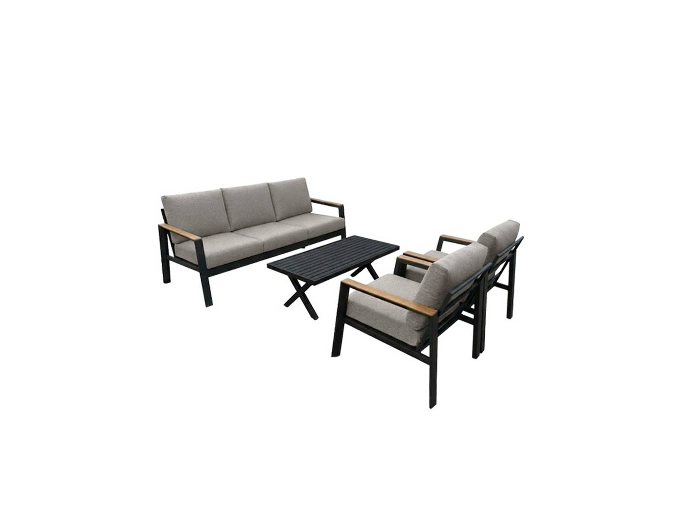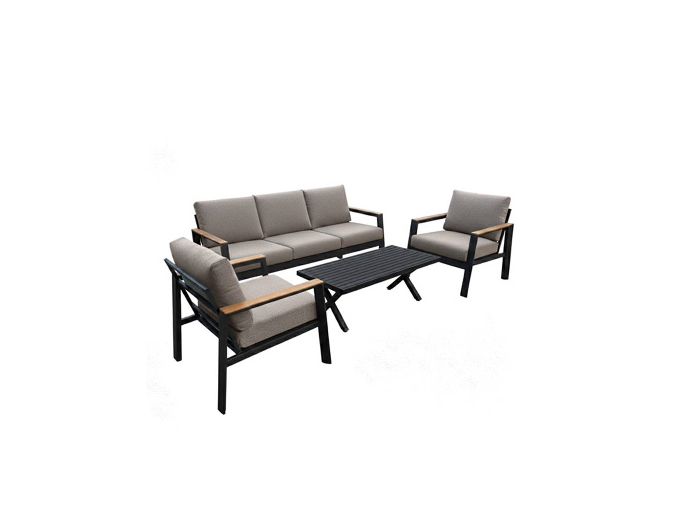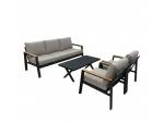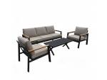 Μοντέρνο σετ από αλουμίνιο σε Ανθρακί χρώμα. Αποτελείται από έναν τριθέσιο καναπέ, δύο πολυθρόνες βολικό τραπέζι. Κατάλληλο για εσωτερική και εξωτερική χρήση. Ιδανικό και για επαγγελματικό εξοπλισμό (ξενοδοχεία ,καφετέριες).