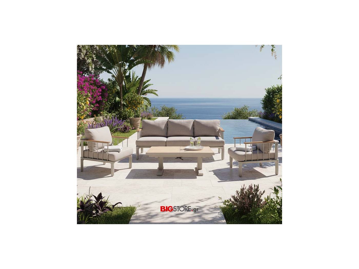 Μοντέρνο SET σαλόνι & τραπεζαρία κήπου από Αλουμινίο με τραπέζι που επεκτείνει την επιφάνειά του και ρυθμίζεται στο ύψος ανάλογα τη χρήση.