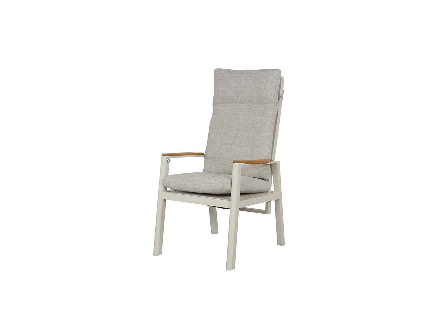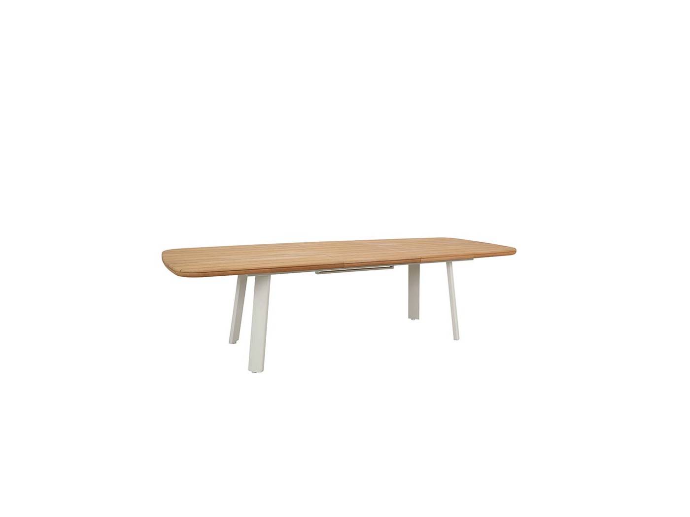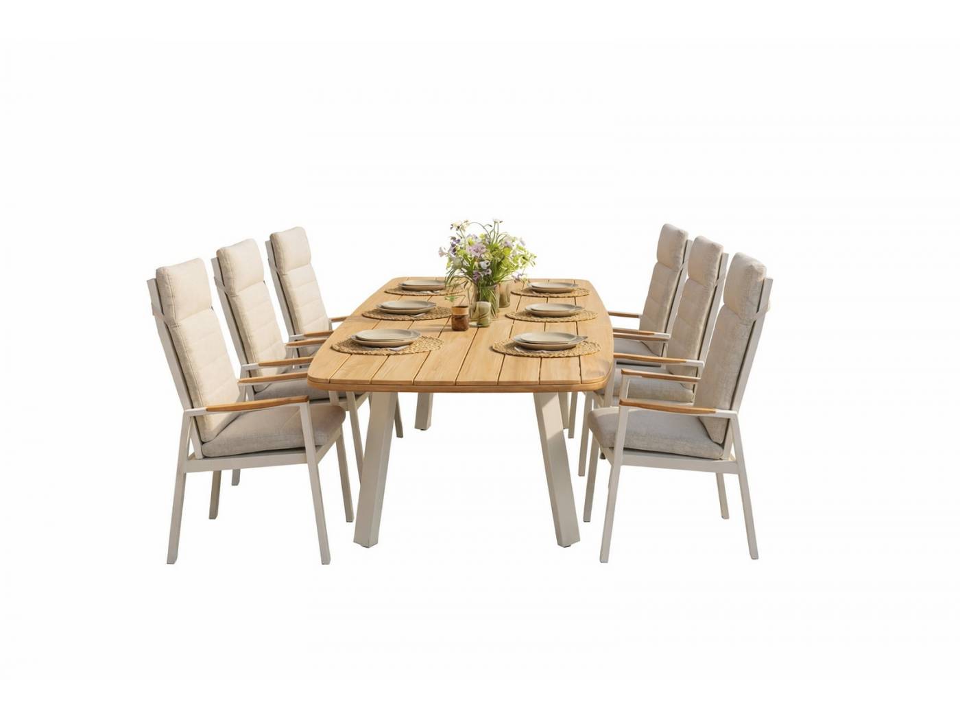 Εξαιρετικης αισθητικής και ποιότητας Τραπεζαρία με σκελετό από αλουμίνιο και επιφάνειες από ξύλο Teak. ένα τραπέζι επεκτεινόμενο έως 270 εκ. και έξι Πολυθρόνες με ανάκληση της πλάτης