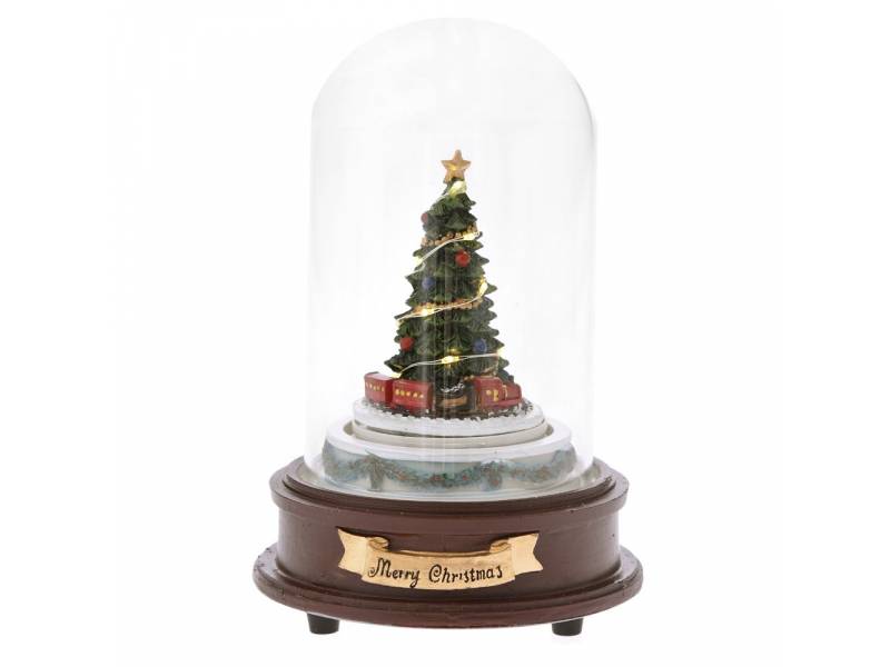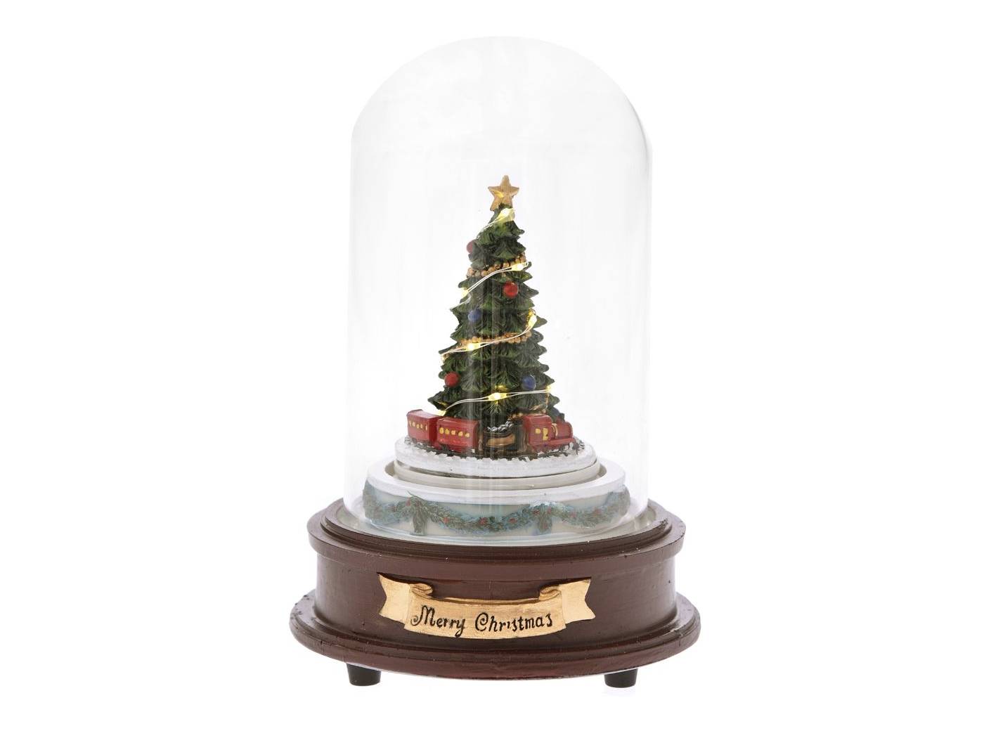 Διακοσμητικό φωτιζόμενο δενδράκι σε γυάλινη καμπάνα. Το δενδράκι γυρνάει γύρω γύρω. Ειναι όλα κολημένα πάνω σε ξύλινη βάση. Λειτουργεί με μπαταρίες 3AAA που δεν περιέχονται.