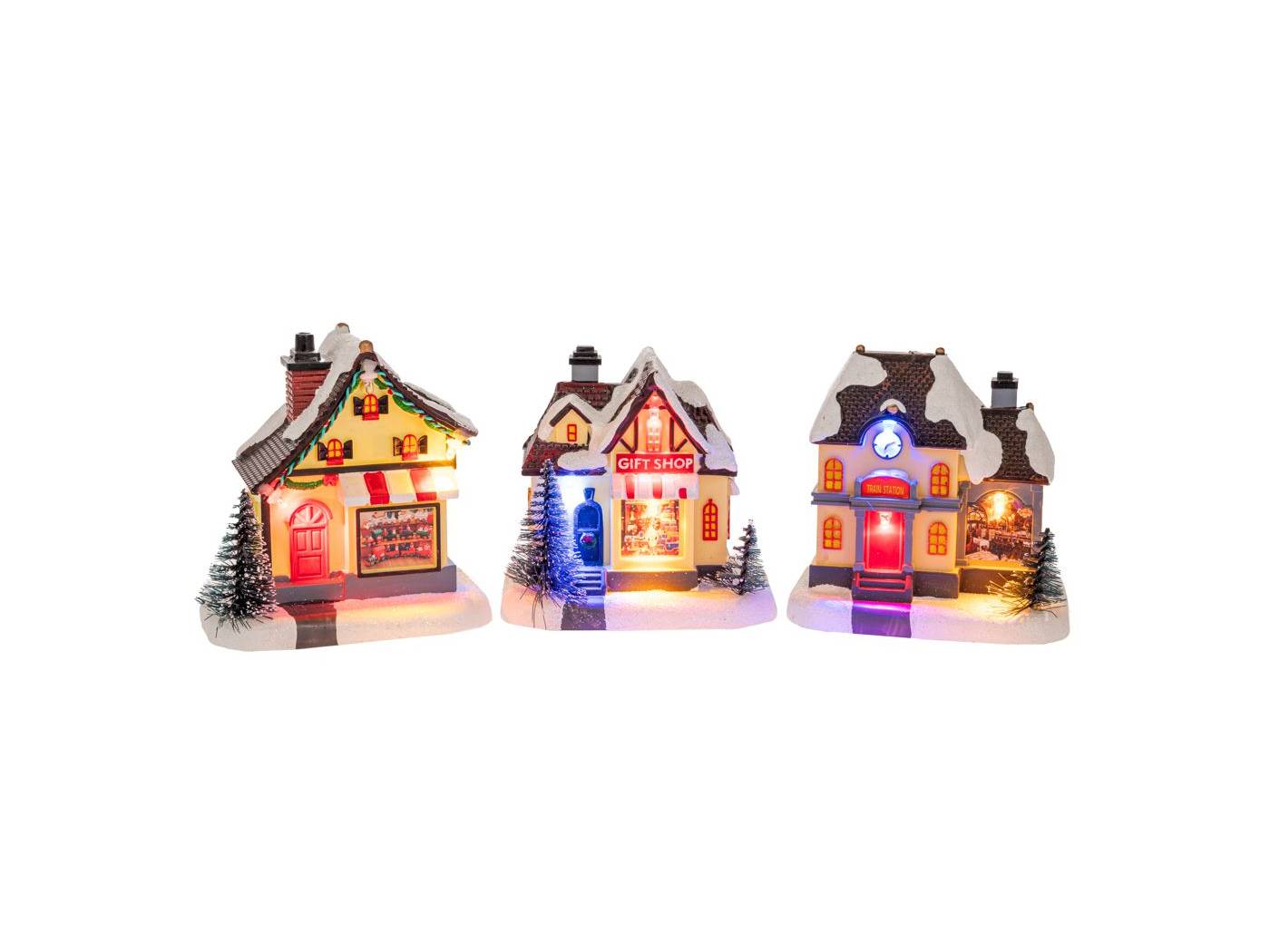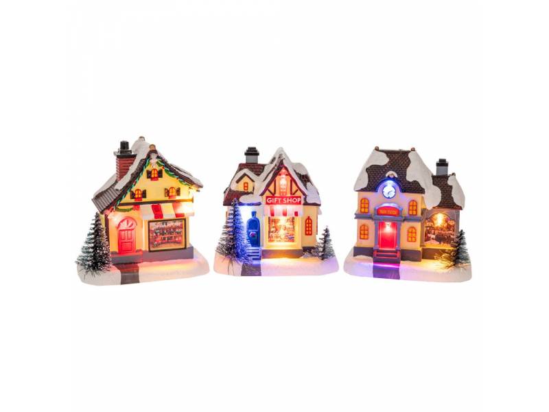 Χριστουγεννιάτικα σπιτάκια σετ των 3 τεμαχίων. Διαθέτουν led φωτισμό και λειτουργούν με μπαταρίες οι οποίες δεν περιλαμβάνονται.