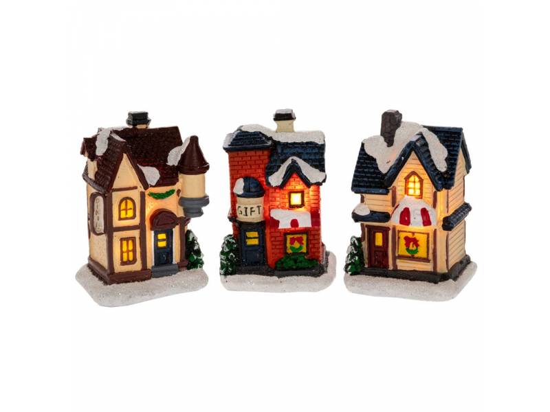 Χριστουγεννιάτικα σπιτάκια σετ των 3 τεμαχίων. Διαθέτουν led φωτισμό και λειτουργούν με μπαταρίες οι οποίες δεν περιλαμβάνονται.