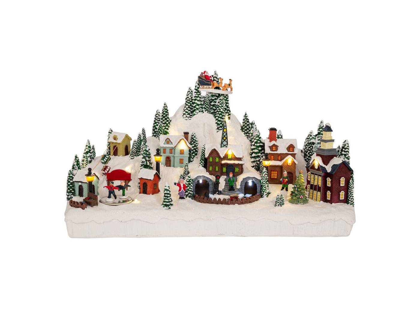 Χριστουγεννιάτικο φωτιζόμενο χωριό με σπιτάκια και τρένο που κινείται μέσα σε τούνελ. Τα παιδάκια γυρνάνε γύρω-γύρω και παίζει μουσική. Η μουσική έχει κουμπί On/Off.