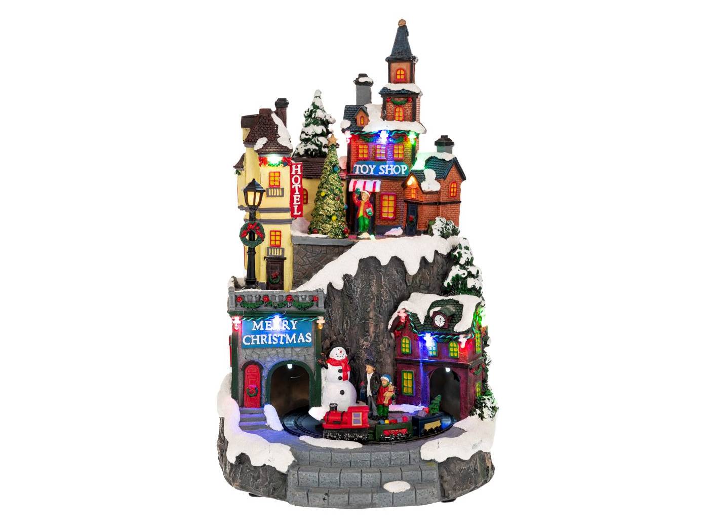 Χριστουγεννιάτικο εντυπωσιακό χωριό με πολλά φωτιζόμενα σπίτια και τρένο που γυρνάει γύρω γύρω. Εχει φως σε αρκετά σημεία και μουσική με 8 τραγούδια. Η μουσική έχει κουμπί On/Off. Λειτουργεί με ρεύμα με μετασχηματιστή 4.5V που περιέχεται.