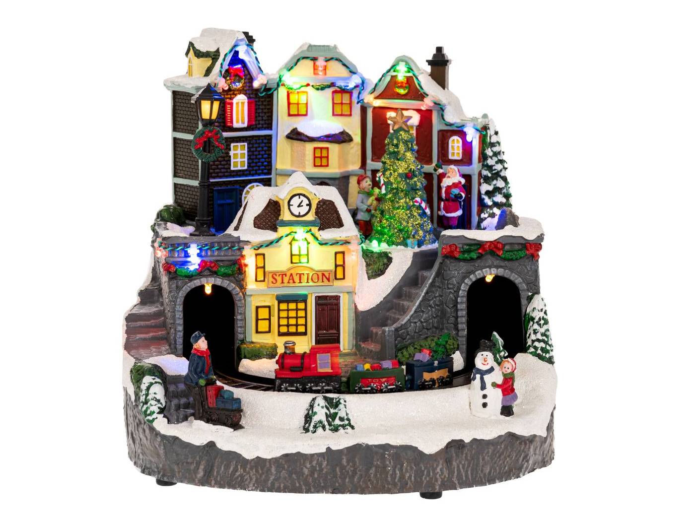 Χριστουγεννιάτικο εντυπωσιακό χωριό με πολλά φωτιζόμενα σπίτια και τρένο που γυρνάει γύρω γύρω, μέσα σε τούνελ. Εχει φως σε αρκετά σημεία και μουσική με 8 τραγούδια. Η μουσική έχει κουμπί On/Off. Λειτουργεί με ρεύμα με μετασχηματιστή 4.5V που περιέχεται. Υλικό κατασκευής πολυρεζίνη και πλαστικό. Πολύ καλή απεικόνιση και ποιότητα κατασκευής. Τo προιόν μπορεί να έχει μικρές χρωματικές διαφορές απο την φωτογραφία.