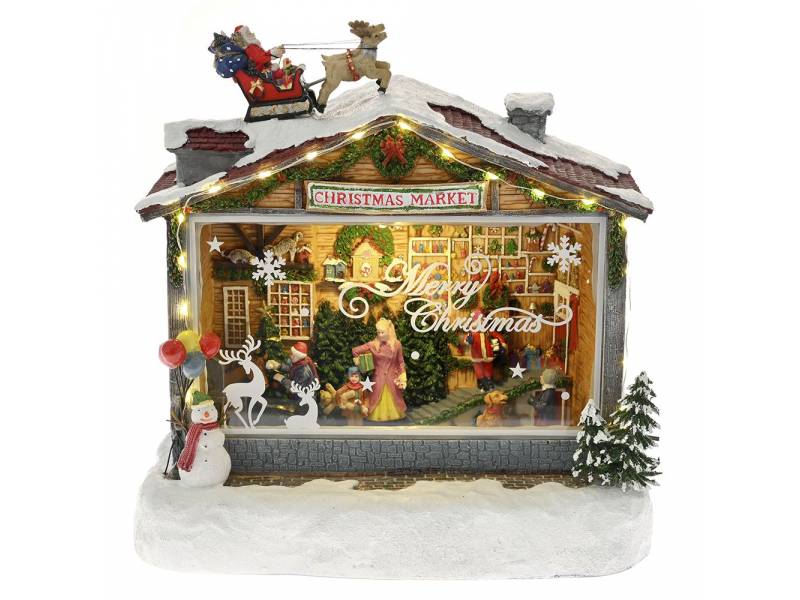 Χριστουγεννιάτικο εντυπωσιακό φωτιζόμενο μαγαζί Christmas market. Εχει φωτάκια σε αρκετά σημεία, κίνηση σε κάποια στοιχεία και παίζει μουσική. Εχει κουμπί on/off για την μουσική. Λειτουργεί με ρεύμα με μετασχηματιστή 4.5V που περιέχεται. Υλικό κατασκευής πολυρεζίνη και πλαστικό.