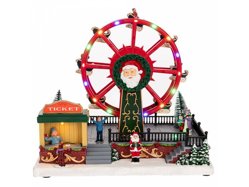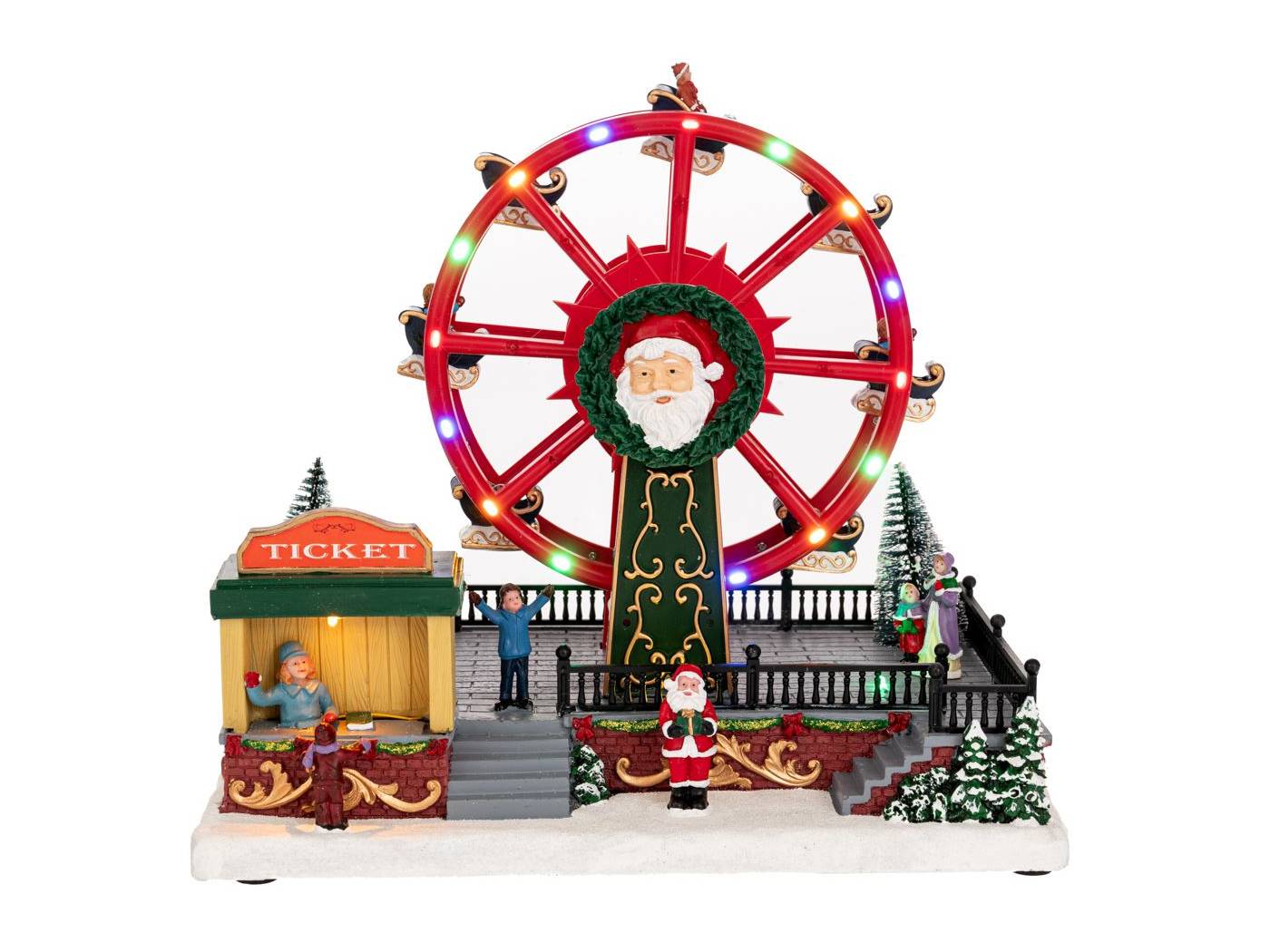 Χριστουγεννιάτικη σκηνικό λούνα παρκ με εντυπωσιακή ρόδα καρουζέλ που περιστρέφεται και φωτιζόμενο εκδοτήριο. Η ρόδα είναι διακοσμημένη με led πολύχρωμα φωτάκια καθώς και με το πρόσωπο του Άγιου Βασίλη.