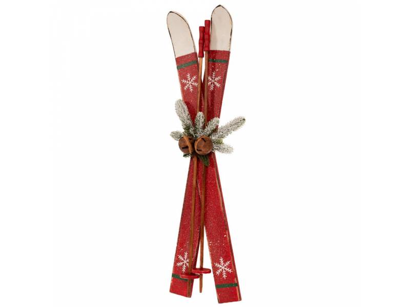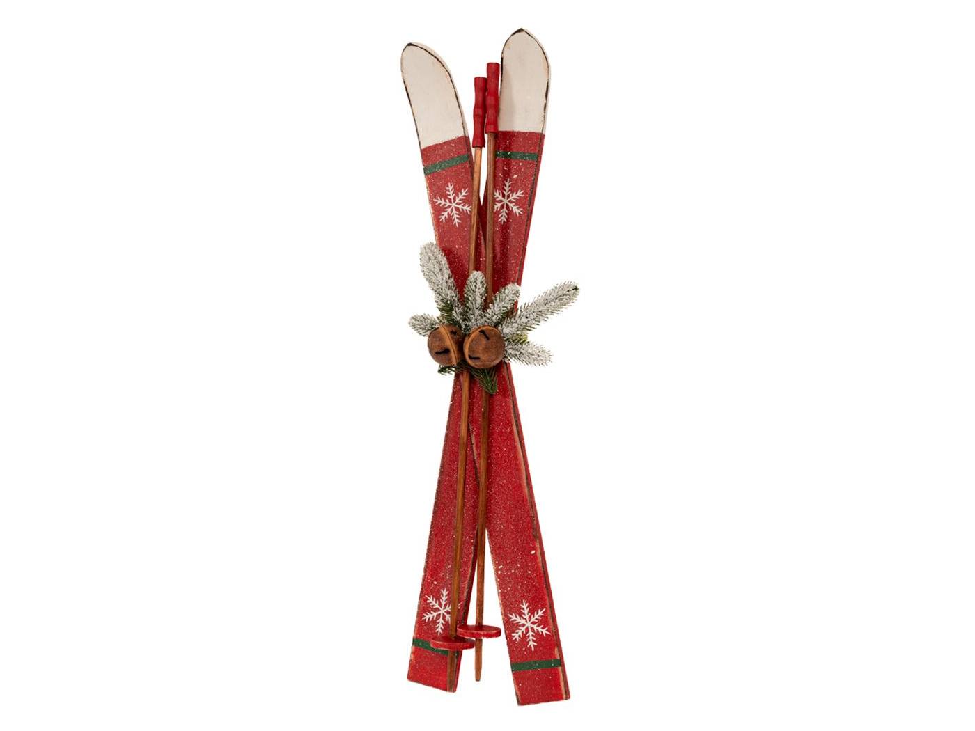 Κόκκινα ξύλινα πέδιλα σκι με καφέ Μπατόν και κουδουνάκια 25x9x75 εκ.