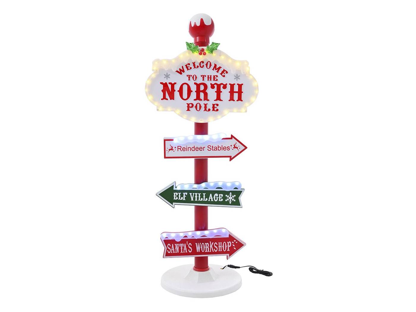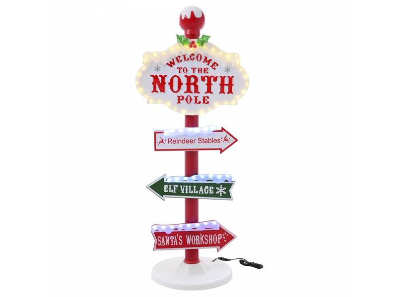 Χριστουγεννιάτικη φωτιζόμενη ταμπέλα North Pole με ταμπέλες. Εχει φως σε αρκετά σημεία και στο περίγραμμα του North pole τα φώτα κάνουν flash. Η μουσική έχει κουμπί On/Off. Λειτουργεί με ρεύμα με μετασχηματιστή 4.5V που περιέχεται. Υλικό κατασκευής πολυρεζίνη και πλαστικό.