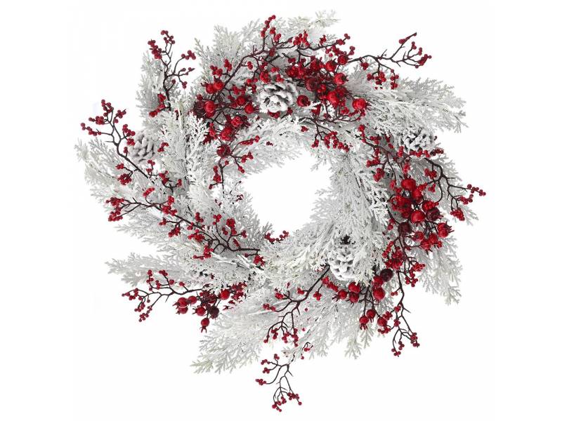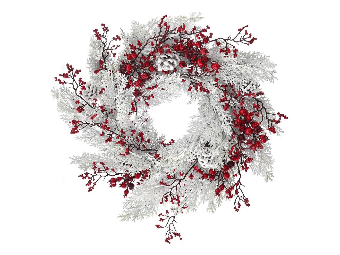 χιονισμένο στεφάνι με κόκκινα berries και κουκουνάρια 55 εκ.