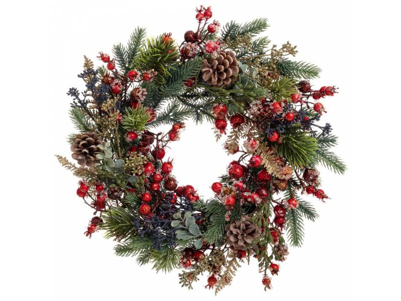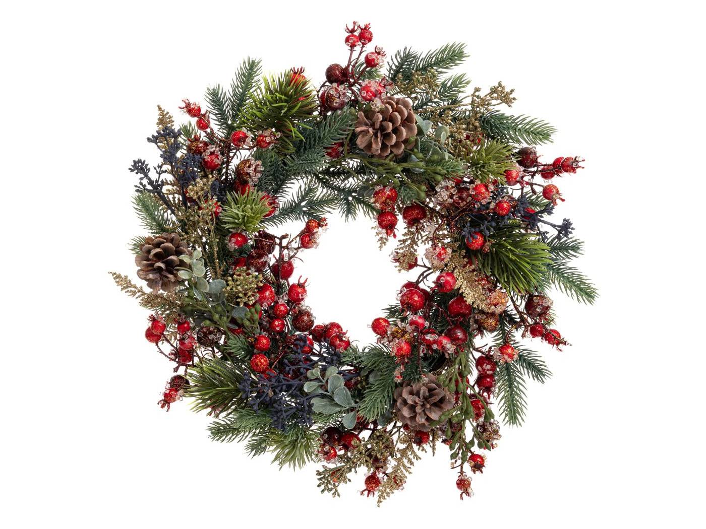 Παγωμένο πράσινο στεφάνι με κόκκινα BERRIES και κουκουνάρια φ40 εκ.-bigstore.gr