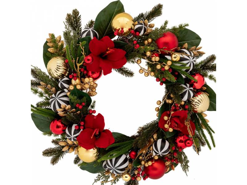 Κόκκινο στεφάνι με τεχνητά άνθη και κόκκινες μπάλες 61x61x17 εκ.