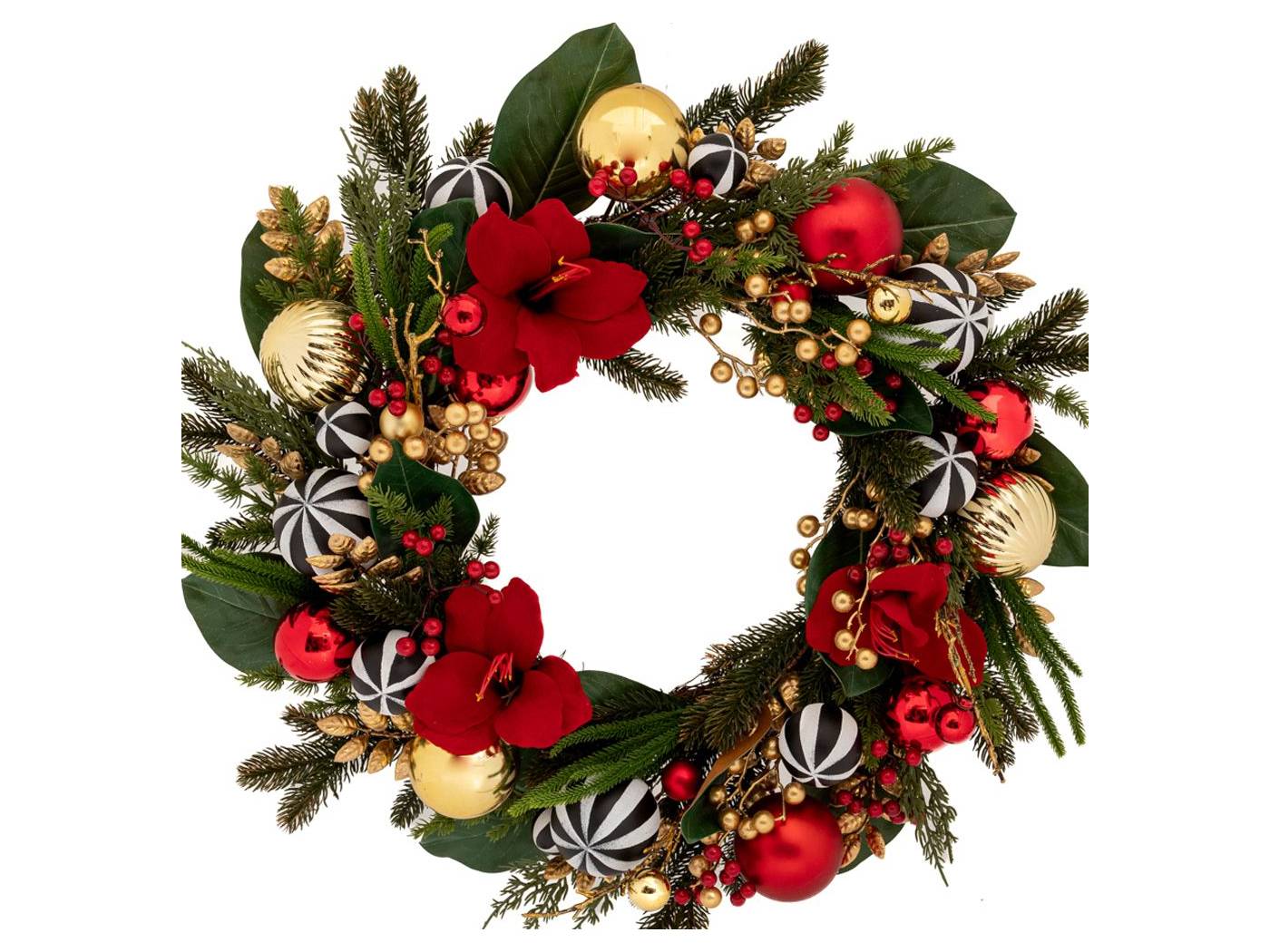 Κόκκινο στεφάνι με τεχνητά άνθη και κόκκινες μπάλες 61x61x17 εκ.-bigstore.gr