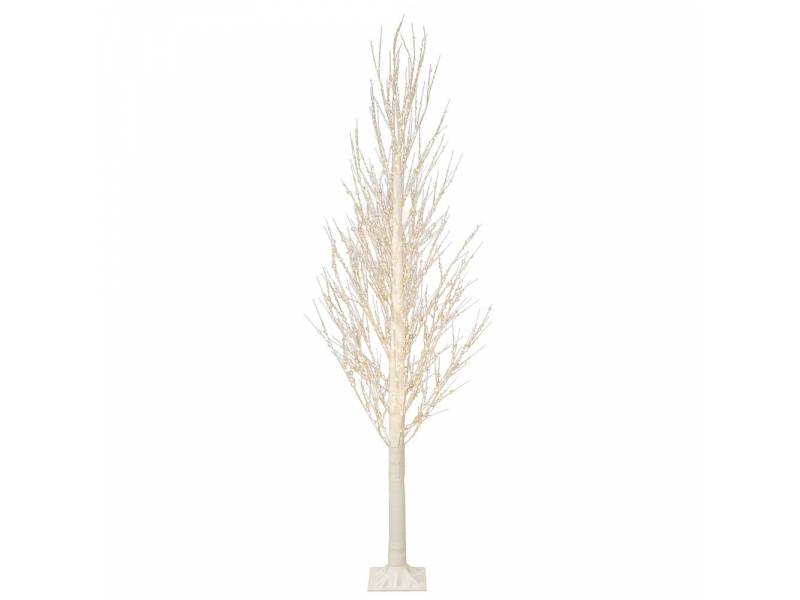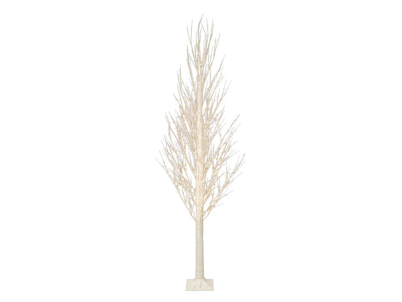 Διακοσμητικό λευκό δέντρο ύψους 150εκ. Διαθέτει 750 led λαμπάκια σε θερμό χρώμα και είναι τοποθετημένο σε λευκή μεταλλική βάση.