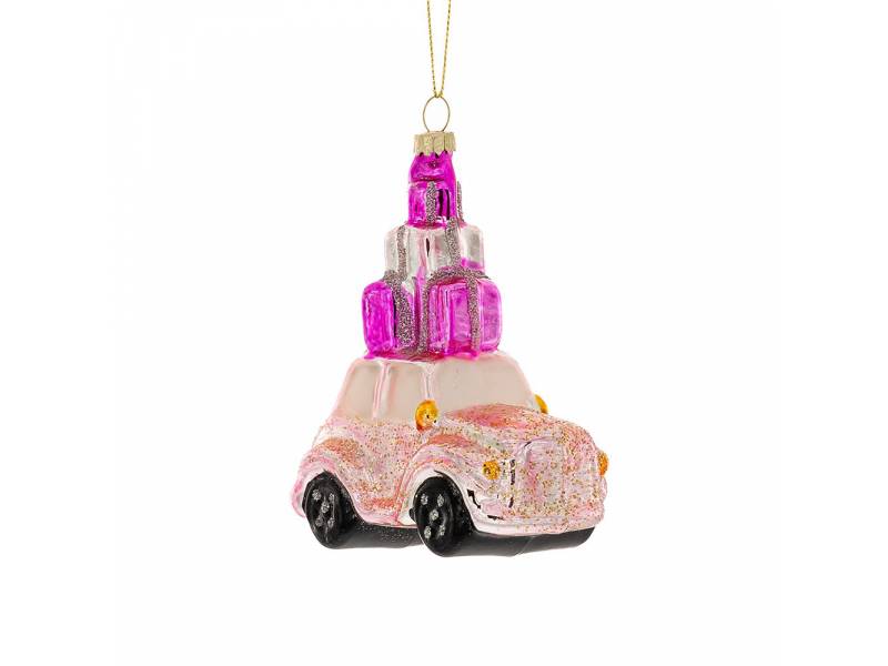 Ροζ γυάλινο κρεμαστό στολίδι αυτοκίνητο με δώρα 9,5x5x11 εκ.