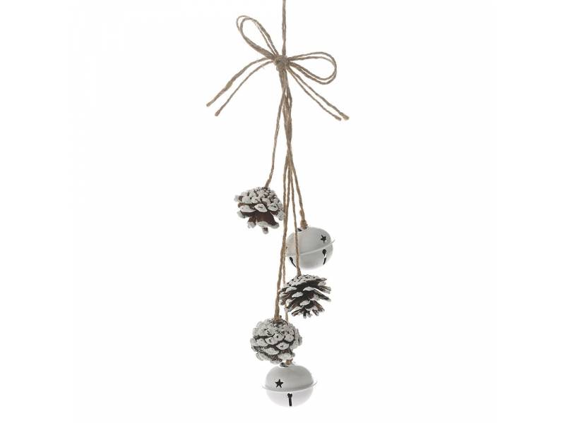 Ασπρο μεταλλικό κρεμαστό με κουδούνια και κουκουνάρες, 33 εκ.