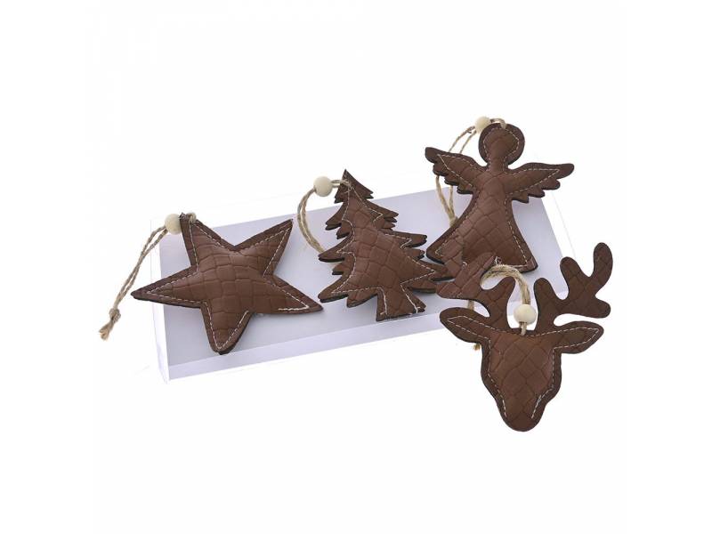 Σετ 4 καφέ δερμάτινα κρεμαστά στολίδια 8 εκ. σε κουτί
