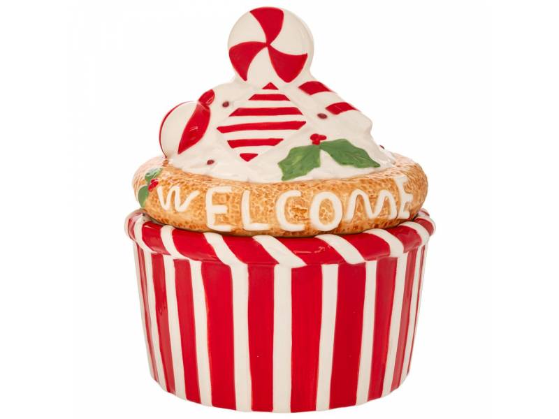 Κόκκινη λευκή κεραμική μπισκοτιέρα σε σχήμα χριστουγεννιάτικο CUPCAKE 18x18x22 εκ.-bigstore.gr