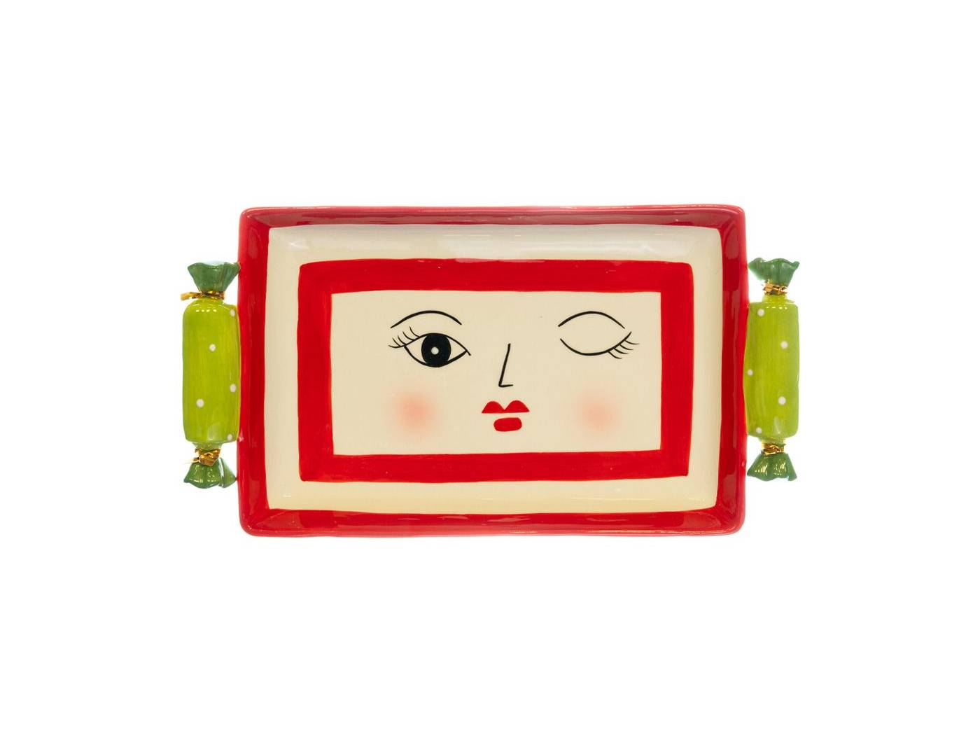Κόκκινη λευκή κεραμική πιατέλα με καραμέλες στα χερούλια 27x14x4 εκ.