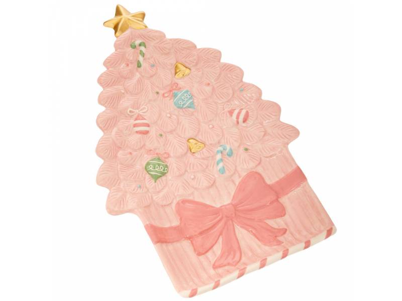 Ροζ κεραμική πιατέλα σε σχήμα χριστουγεννιάτικο δέντρο με χρυσό αστέρι 37x23x4 εκ.