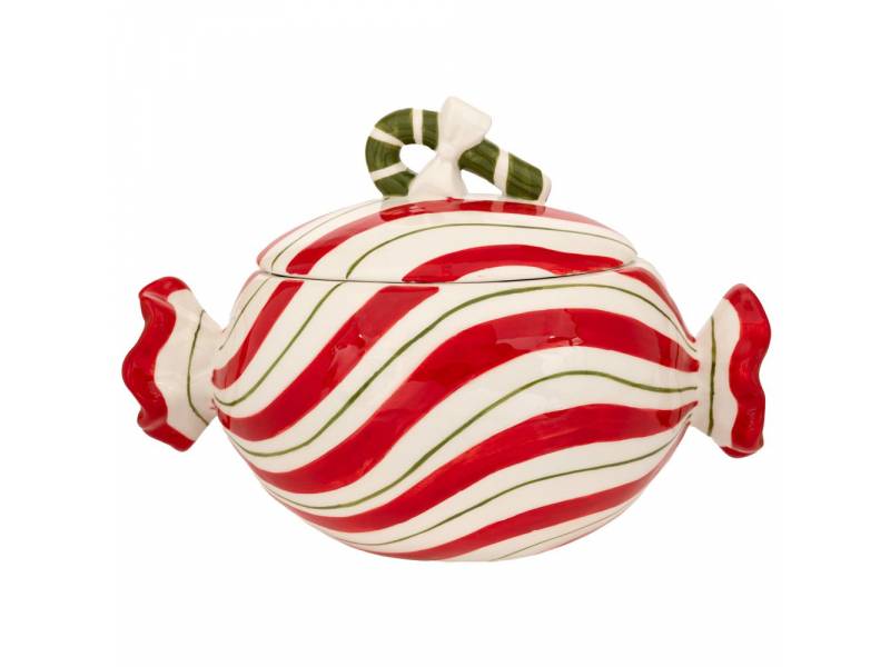 Λευκή με κόκκινες ρίγες κεραμική μπισκοτιέρα σε σχήμα καραμέλας 21,5x13x15 εκ.-bigstore.gr