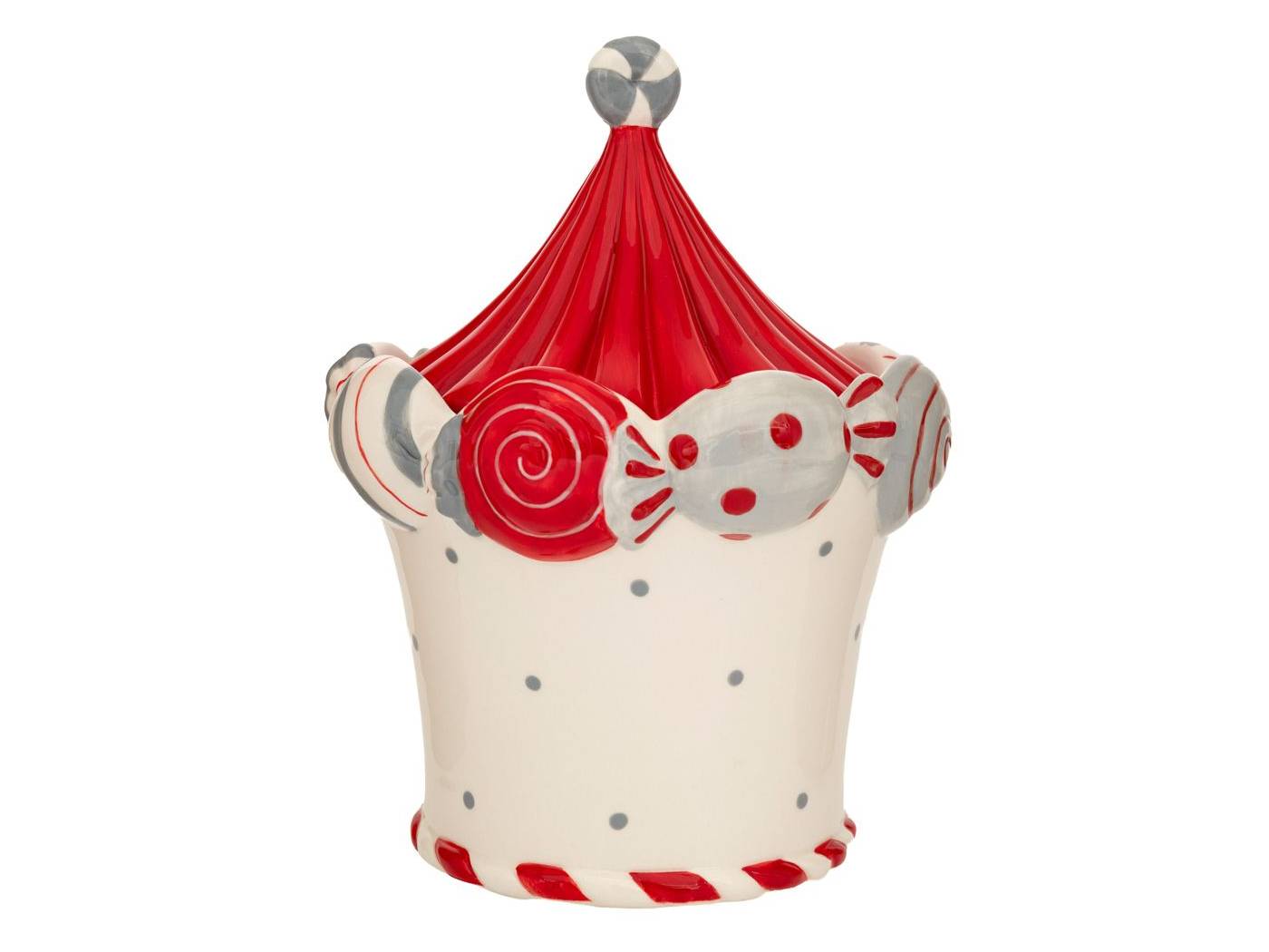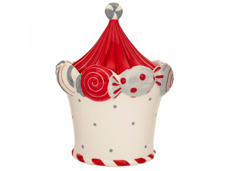 Λευκή κεραμική μπισκοτιέρα με κόκκινο καπάκι και καραμέλες 18x18x23 εκ.