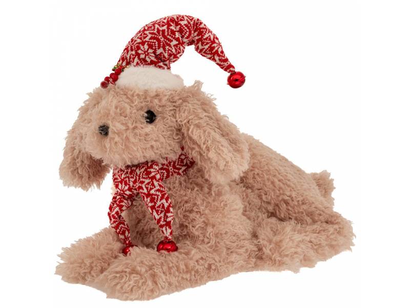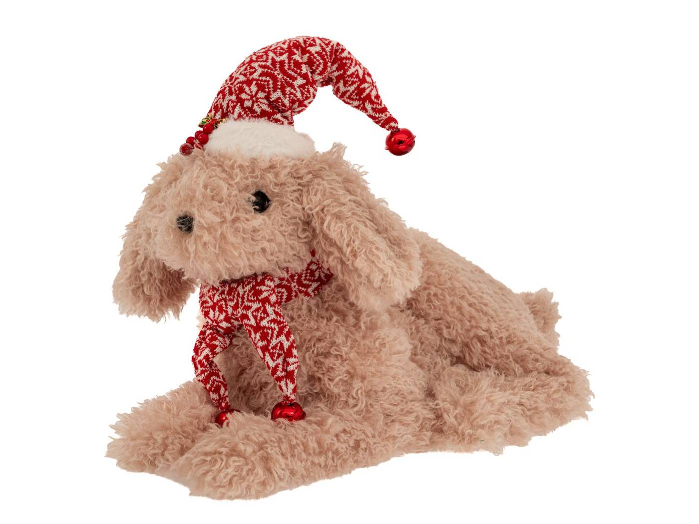 Μπεζ υφασμάτινος ξαπλωτός σκύλος με κόκκινο κασκόλ και σκούφο 59x32x30 εκ.-bigstore.gr