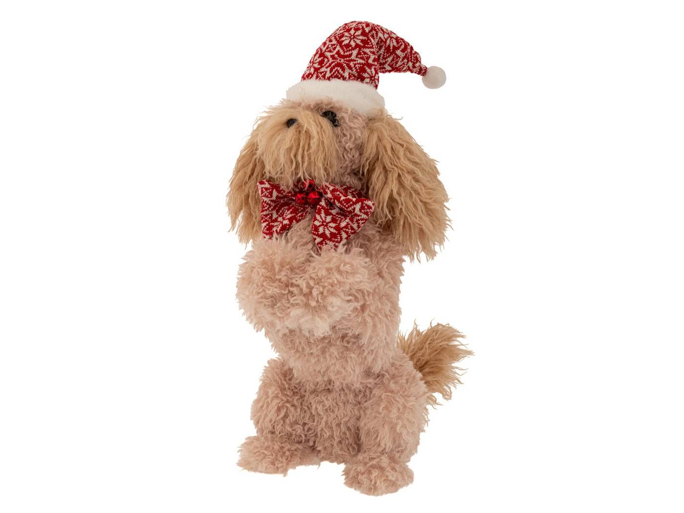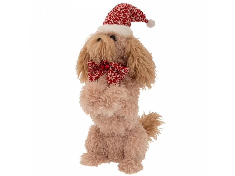 Μπεζ υφασμάτινος σκύλος με κόκκινο σκούφο και κασκόλ 21x37x54 εκ.-bigstore.gr