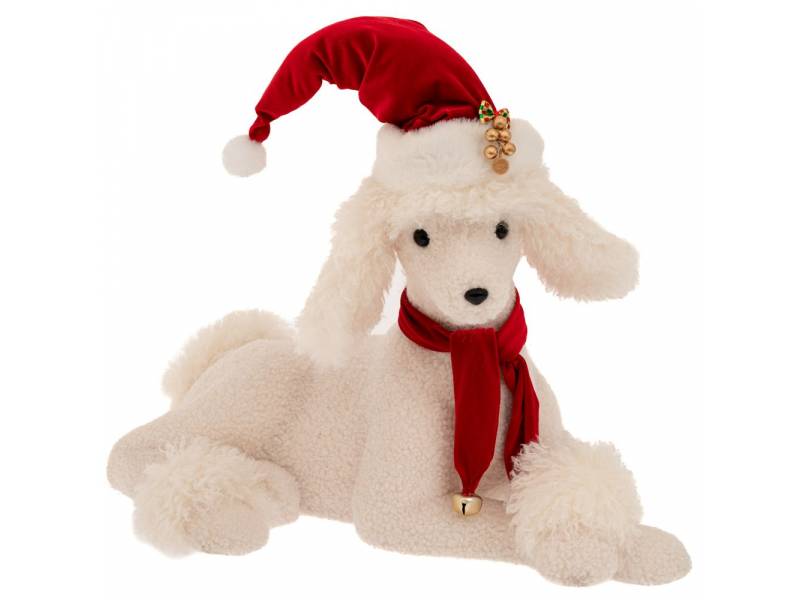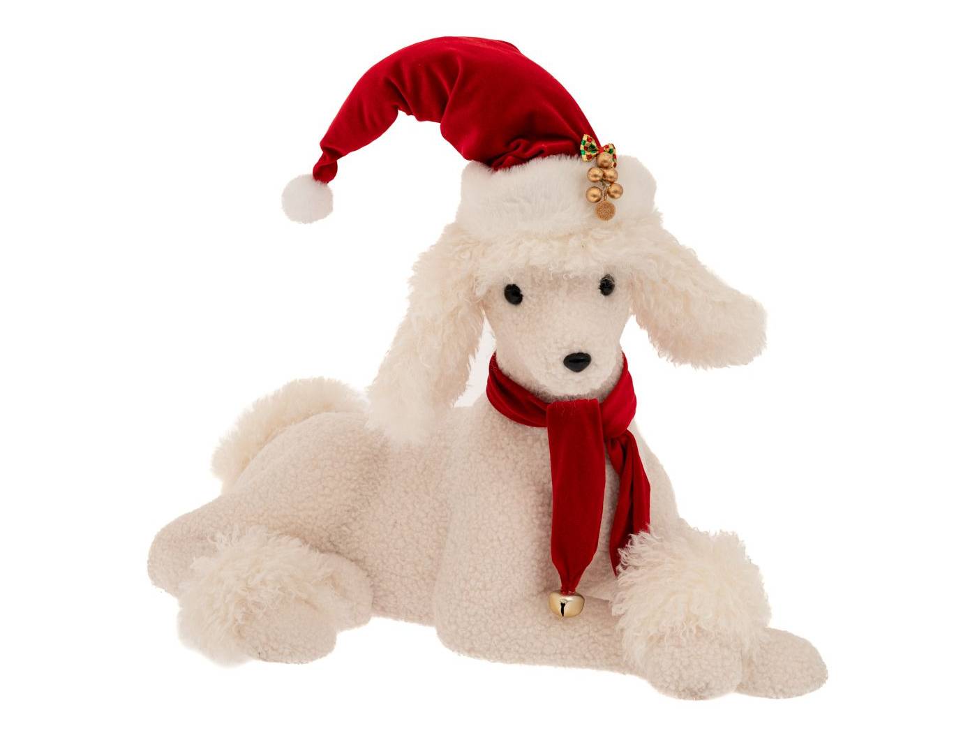 Λευκός υφασμάτινος καθιστός σκύλος με κόκκινο σκούφο και κασκόλ 54x31x37 εκ.