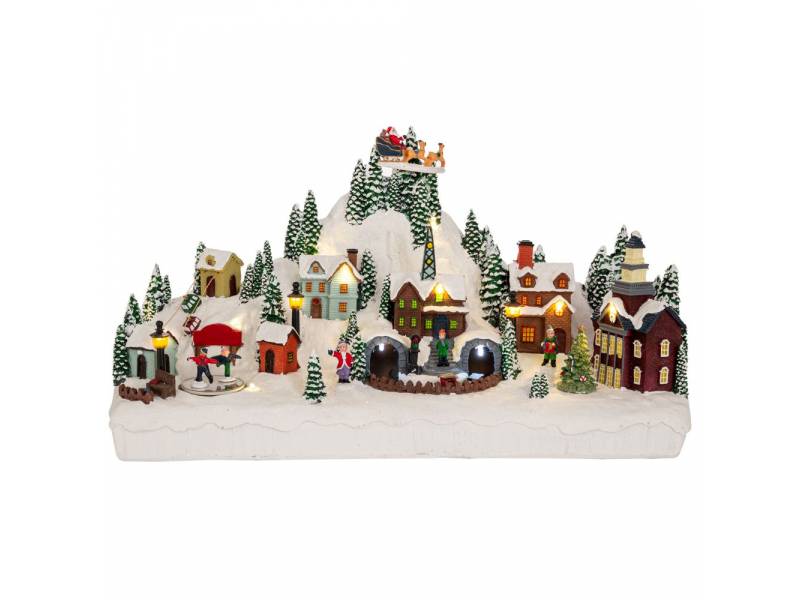 Χριστουγεννιάτικο φωτιζόμενο χωριό με σπιτάκια και τρένο που κινείται μέσα σε τούνελ. Τα παιδάκια γυρνάνε γύρω-γύρω και παίζει μουσική. Η μουσική έχει κουμπί On/Off. Λειτουργεί με ρεύμα με μετασχηματιστή 4.5V που περιέχεται. Υλικό κατασκευής πολυρεζίνη και πλαστικό. Πολύ καλή απεικόνιση και ποιότητα κατασκευής. Τo προιόν μπορεί να έχει μικρές χρωματικές διαφορές απο την φωτογραφία.