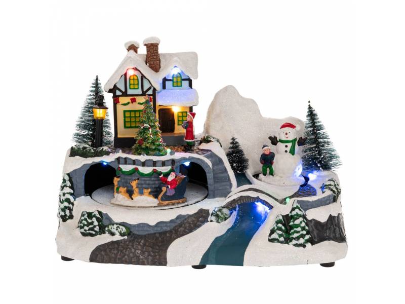 Χριστουγεννιάτικο φωτιζόμενο σκηνικό με Άγιο Βασίλη που κινείται μέσα σε έλκηθρο μπροστά από ένα φωτιζόμενο σπίτι. Λειτουργεί με 3 μπαταρίες ΑΑ οι οποίες δεν περιέχονται.