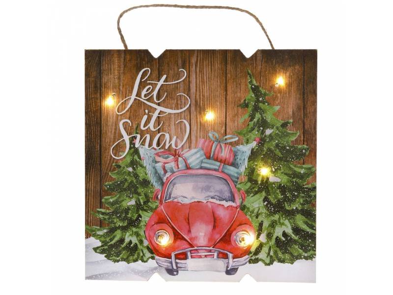 Ξύλινη κρεμαστή πινακίδα, let it snow, με φορτηγό και με φωτάκια στο εσωτερικό. Τα λαμπάκια λειτουργούν με μπαταρίες ΑΑ που δεν περιέχονται.